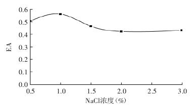 [9]等人在研究鷹嘴豆分離蛋白乳化性質時,選用不同梯度的離子濃度,分別為0.1、0.2、0.4、0.6、0.8mol/L的NaCl溶液,測定乳化活性和乳化穩定性。結果如下: