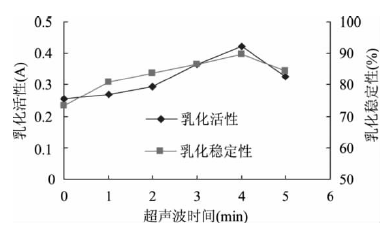 從圖中明確看出,處理時間為4min時,乳化活性和乳化穩定性達到**大值。這是因為在超聲波作用下,蛋白質分子的結構變得疏松,使疏水性多肽部分展開朝向脂質,極性部分朝向水相,故乳化活力增加。但繼續延長超聲波處理時間,蛋白質變性程度增大,不溶性蛋白質含量增多,乳化活力及乳化穩定性隨之又降低。