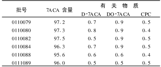 3.3 樣品測(cè)定 取本品約20mg,精密稱定,置100ml容量瓶中,加流動(dòng)相溶解并稀釋**刻度,搖勻,取10uL注入液相色譜儀,記錄色譜圖;另取對(duì)品適量,同法測(cè)定,按外標(biāo)法以峰面積計(jì)算供試品中的7ACA含量,以峰面積歸一法計(jì)算有關(guān)物質(zhì)的含量,結(jié)果(見表)。
